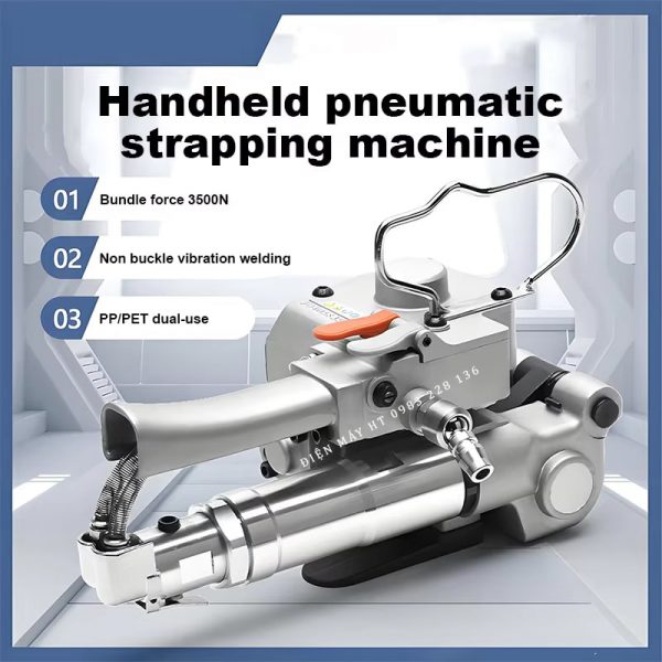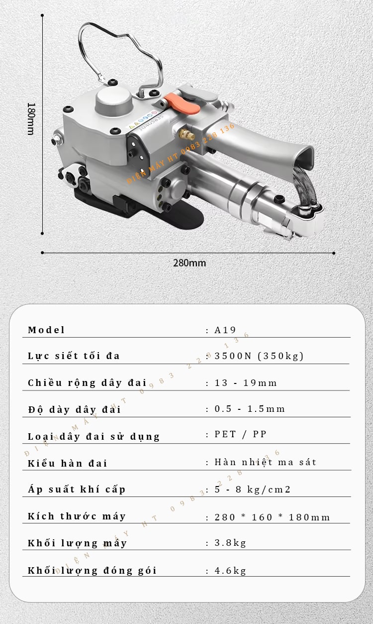 Máy đóng đai cầm tay A19 là chiếc máy hoạt động bằng khí nén. Có thiết kế nhỏ gọn dễ dàng vận hành đóng đai cho kiện hàng lớn, pallet…
