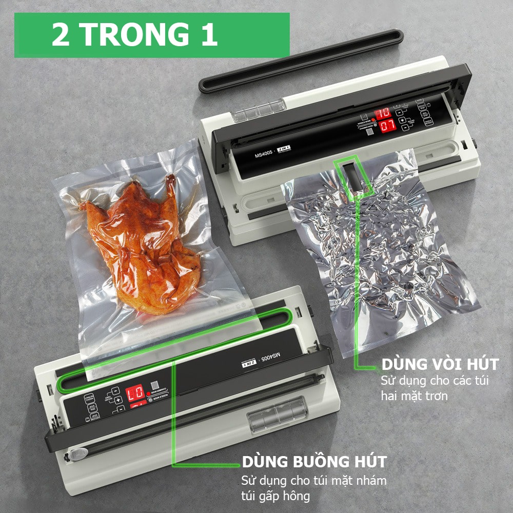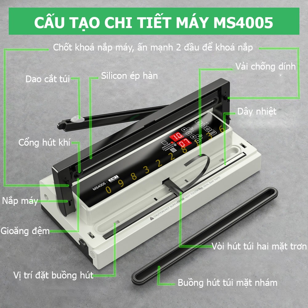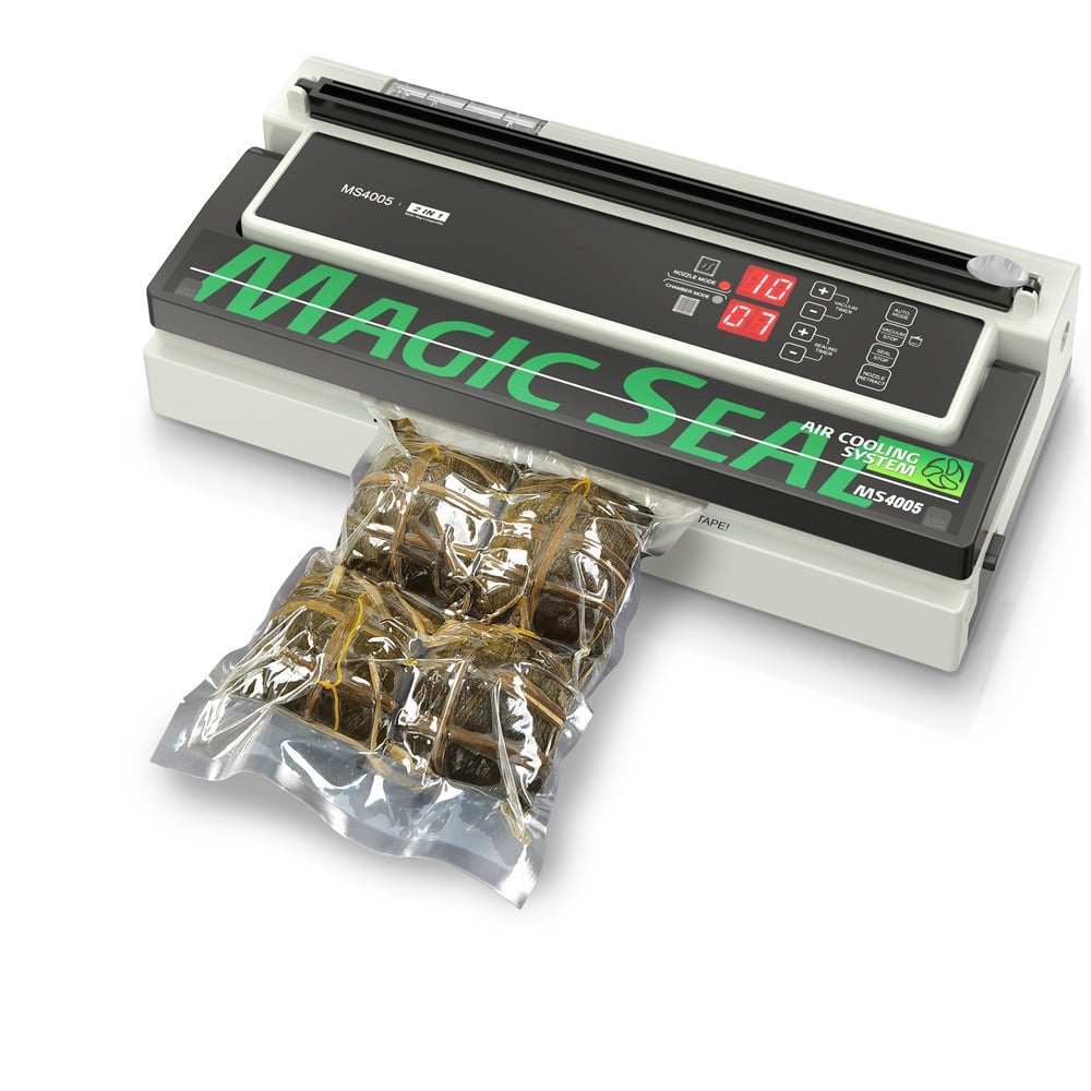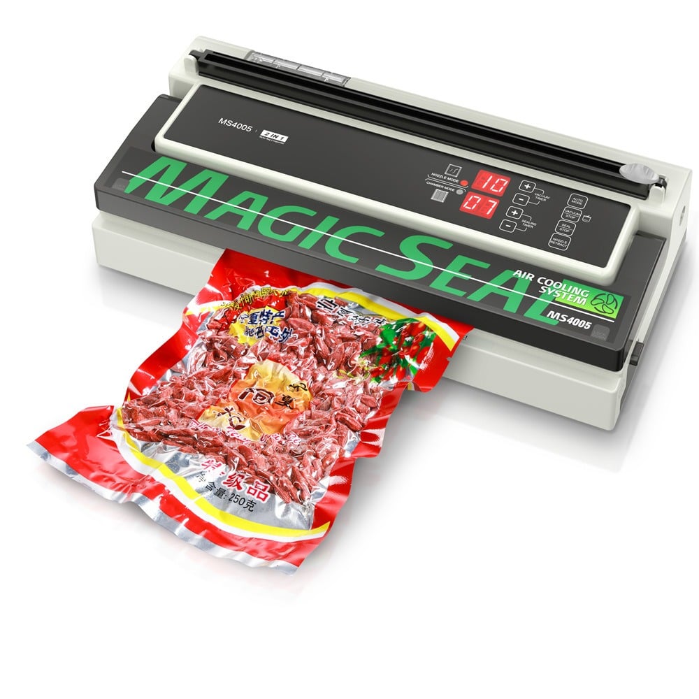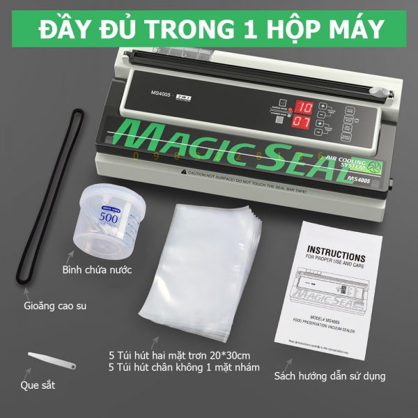 Máy hút chân không Magic MS4005 là chiếc máy đến từ thương hiệu Magic Seal. Một thương hiệu nổi tiếng về máy hút chân không của nội địa Trung Quốc. Ở phiên bản máy Magic Seal MS4005 này sẽ được nâng cấp để có thể sử dụng được cho tất cả các loại túi hút chân không: túi hai mặt trơn; túi mặt nhám; túi zip; túi chống tĩnh điện; túi giấy kraft; túi đựng chè Thái Nguyên, gạo…